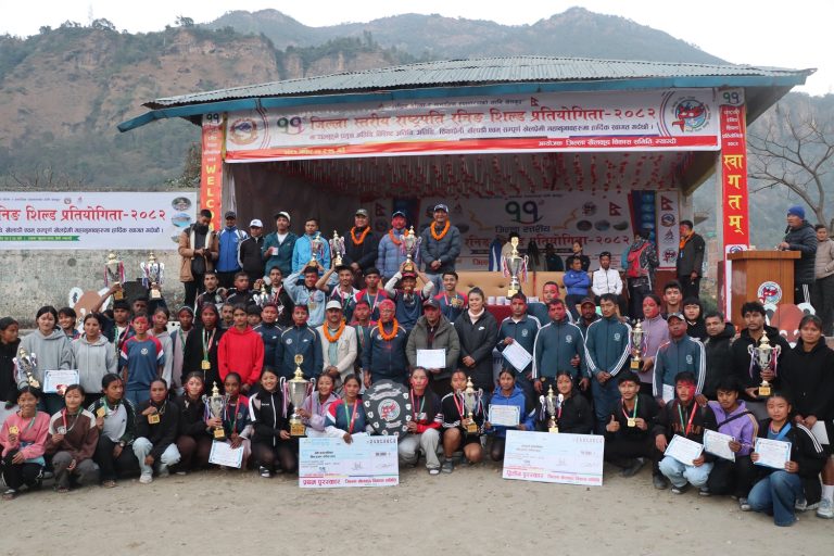म्याग्दी। बेनीमा आज सम्पन्न ११औँ जिल्लास्तरीय राष्ट्रपति रनिङ शिल्ड खेलकुद प्रतियोगिताको उपाधि बेनी नगरपालिकाले जितेको छ । जिल्ला खेलकुद विकास समितिले आयोजना गरेको प्रतियोगितामा २५ स्वर्ण, १४ रजत र छ कास्य पदकसहित बेनी नगरपालिका विजयी भएको हो । आठ स्वर्ण, पाँच रजत र तीन कास्य पदक जितेको अन्नपूर्ण गाउँपालिका दोस्रो