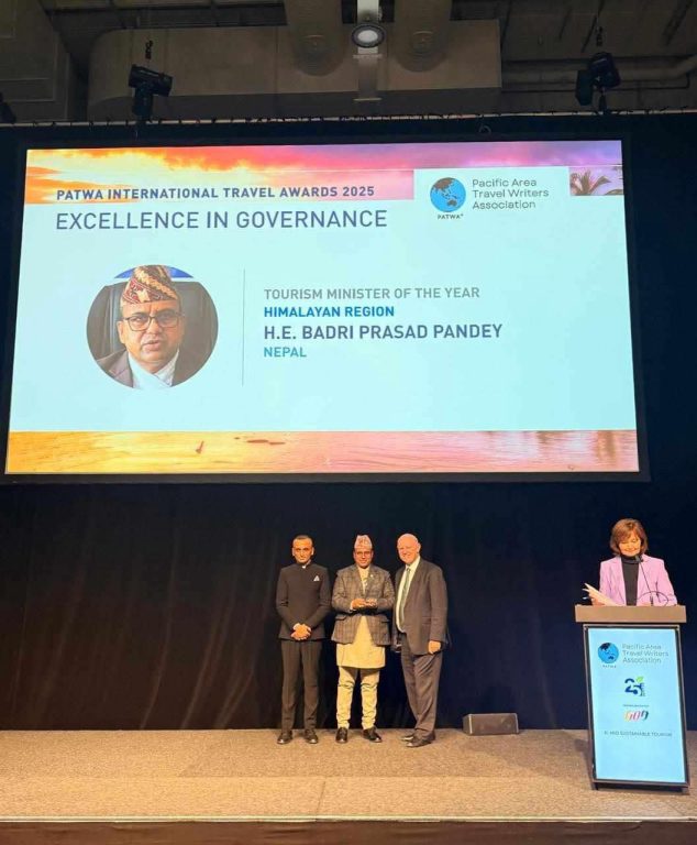 काठमाडौं । जर्मनीको बर्लिनमा संस्कृति, पर्यटन तथा नागरिक उड्डयनमन्त्री बद्री प्रसाद पाण्डेलाई हिमालयन क्षेत्रका मुलुकहरुबाट वर्षको उत्कृष्ट पर्यटनमन्त्री (टुरिजम् मिनिस्टर अफ दी एयर) अवार्ड प्रदान गरिएको छ । बर्लिनमा प्यासिफिक एरिया ट्राभल राइटर्स एसोसियसन (पाटवा) ले आयोजना गरेको ’वल्र्ड टुरिजम् एण्ड एभिएसिन समिट–२०२५’ को अवसरमा मन्त्री पाण्डेलाई हिमालयन क्षेत्रबाट ’टुरिजम्