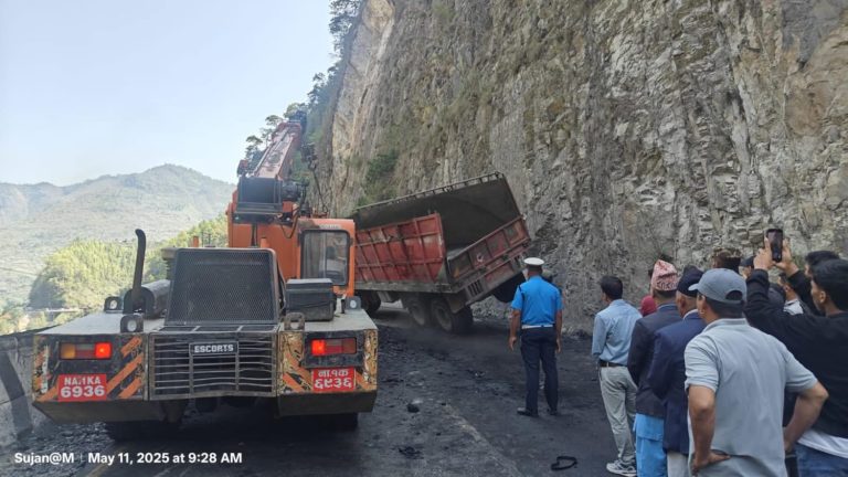 तुइनखोलामा ट्रक पल्टियो, मुग्लिन–नारायणगढ सडक अवरुद्ध