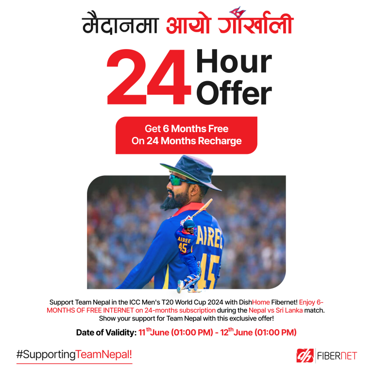 काठमाडौँ । जारी आईसीसी पुरुष टि–२० विश्वकपमा नेपालले ग्रुप स्टेज अन्तर्गत भोली बुधबार बिहान ५:१५ बजे श्रीलंकासँग आफ्नो दोस्रो खेल खेल्दै छ । यी दुई टिमबीचको खेलको खुसीयालीमा डिशहोम फाइबरनेटले २४ महिनाको रिचार्ज गर्दा अतिरिक्त ६-महिनाको सब्सक्रिप्सन नि:शुल्क पाउने अफर ल्याएको छ । डिशहोमले आज दिउसो १ बजे ‘आयो गोर्खाली