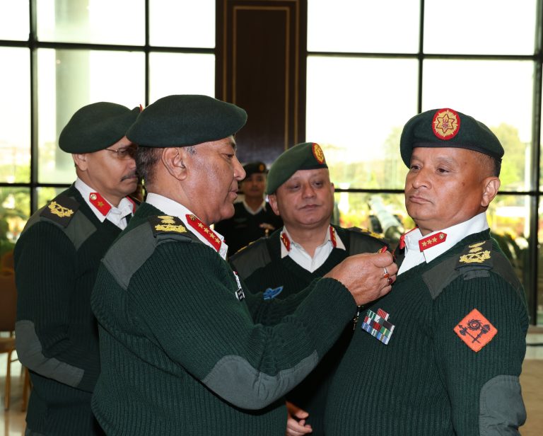 काठमाडौँ । प्रधानसेनापति अशोकराज सिग्देलले रथीमा दर्जामा पदोन्नति हुनुभएका प्रदीपजङ्ग केसीलाई दज्र्यानी चिन्ह प्रदान गर्नुभएको छ । नेपाल सरकार, मन्त्रिपरिषद्को यही मङ्सिर १० गतेको निर्णयबाट केसी रथीमा पदोन्नति हुनु भएको हो । पदोन्नतिसँगै उहाँलाई बलाध्यक्षमा नियुक्त गरिएको सैनिक जनसम्पर्क तथा सूचना निर्देशनालयले जनाएको छ ।