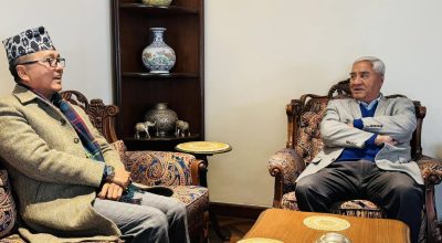 काठमाडौँ । नेपाली कांग्रेसका सभापति शेर बहादुर देउवा र राष्ट्रिय प्रजातन्त्र पार्टी (राप्रपा)का अध्यक्ष एवं पूर्व उपप्रधानमन्त्री राजेन्द्र लिङ्देनबीच भेटवार्ता