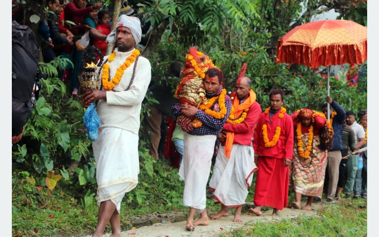 मलेखु । अघिअघि पञ्चेबाजासँगै नाङ्गो खुँडा, खुकुरी बोकेका युवा । त्यसपछि दियो, कलश, शङ्ख, घण्टसहितका नरनारी, प्रहरी र भक्तजनले बनाएको हाते साङ्लोको घेराभित्र लामो कपाल मात्र देखिने प्रतिमूर्ति । सयौँ मानिस बाटोको दायाँबायाँ बसेर पूजापाठ र अबीर जात्रा गर्दै थिए । धादिङको त्रिपुरासुन्दरी गाउँपालिकाको वडा नं ४ सल्यानकोटबाट त्रिपुरा सुन्दरी
