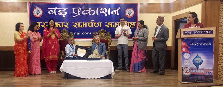 काठमाडौं: नइ प्रकाशनले आज राजधानी काठमाडौँमा नेपाल तथा भारतका २८ जना प्रतिभालाई ताम्रपत्र र नगद राशिसहित २०८० सालका नइ पुरस्कार समपर्ण गर्यो । नइ प्रकाशनका कुलपति इन्दिरा प्रसाईले अध्यात्म दर्शन र सनातन धर्मसंस्कृतिको जागरण, संरक्षण र संवर्धनका लागि सात दशकदेखि प्राज्ञिक रूपमा समर्पित प्रा.चेतोनाथ शर्मा आचार्यलाई एक लाख रुपियाँ राशिसहित