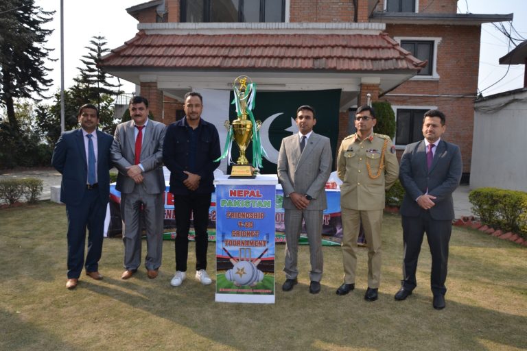 काठमाडौं । पाकिस्तानी दुतावासको आयोजनामा हुने आठौं संस्करणको नेपाल–पाकिस्तान मैत्रिपूर्ण ट्वान्टी–२० क्रिकेट प्रतियोगिताको ट्रफी सोमवार सार्वजनिक गरिएको छ । पाकिस्तानी दुतावासमा आयोजित एक कार्यक्रममा प्रतियोगिताको ट्रफी सार्वजनिक गरिएको हो । सार्वजनिक कार्यक्रमपछि बोल्दै नेपाली टोली पूर्वकप्तान पारस खड्काले प्रतियोगिताबाट नेपाली युवा प्रतिभावन खेलाडीले मौका पाउने गरेको बताउनु भयो । राष्ट्रिय