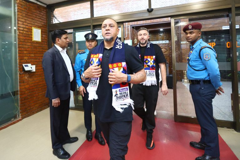 काठमाडौँ । राजधानीमा जारी नेपाल सुपर लिग (एनएसएल) फुटबल प्रतियोगिताको खेल हेर्न ब्राजिलियन लेजेण्ड फुटबल खेलाडी रोबर्टो कार्लोस आज नेपाल आइपुगेका छन् । एनएसएल आयोजकले रोबर्टो कार्लोसलाई त्रिभुवन अन्तरराष्ट्रिय विमानस्थलमा स्वागत गरेको थियो । कार्लोसले नेपाल आउँदा खुशी लागेको उल्लेख गर्दै नेपालमा रहेका ब्राजिलियन फुटबल समर्थकलाई धन्यवादसमेत दिए । उनी