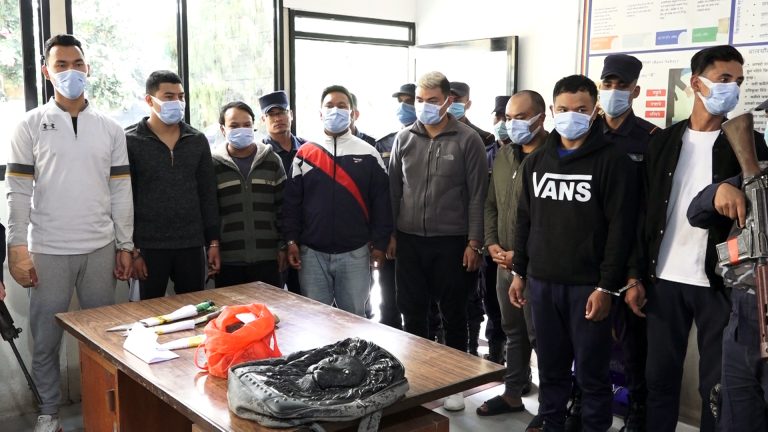 काठमाडौँ । काठमाडौंको सोह्रखुट्टेमा बाउन्सरमाथि खुकुरी प्रहार गरेको आरोपमा पक्राउ परेका आठ जनालाई प्रहरीले सार्वजनिक गरेको छ । जिल्ला प्रहरी परिसर काठमाडौंले पत्रकार सम्मेलन गरी गत असोज २५ गते काठमाडौंको सोह्रखुट्टेमा बाउन्सरमाथि खुकुरी प्रहार गर्ने ८ जनालाई ज्यान मार्ने उद्योग गर्न नहुने कसुरमा पक्राउ गरी प्रहरीले सार्वजनिक गरेको हो ।
