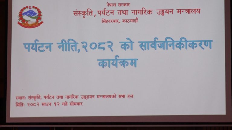काठमाडौँ । सरकारले मुलुकको पर्यटन क्षेत्रको समग्र विकास तथा प्रवद्र्धनका लागि नयाँ पर्यटन नीति सार्वजनिक गरेको छ । सोमवार संस्कृति, पर्यटन तथा नागरिक उड्डयन मन्त्रालयद्वारा आयोजित कार्यक्रमकाबीच मन्त्री बद्रीप्रसाद पाण्डेले नयाँ पर्यटन नीति सार्वजनिक गर्नुभएको हो । मन्त्री पाण्डेले नीति सार्वजनिक गर्दै नेपाललाई अद्वितीय पर्यटकीय गन्तव्यका रूपमा स्थापित गर्न नीति