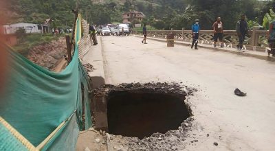 काठमाडौं । पृथ्वी राजमार्ग अन्तर्गत धादिङको थाक्रे गाउँपालिका–७ स्थित सोताङ खोलाको पुलमा भ्वाङ परेपछि सवारी आवागमन ठप्प भएको छ ।