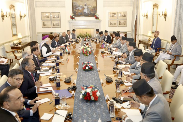 चारदिने औपचारिक भारत भ्रमणमा रहनुभएका प्रधानमन्त्री पुष्पकमल दाहाल ‘प्रचण्ड’ र भारतीय प्रधानमन्त्री नरेन्द्र मोदीका सुरक्षा सल्लाहकार अजित डोभाल र विदेश