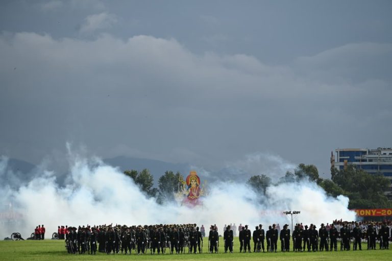 काठमाडौँ: राष्ट्रपति रामचन्द्र पौडेलको प्रमुख आतिथ्यमा सैनिक मञ्च टुँडिखेलमा आज अपराह्न ‘फूलपाती बढाइँ समारोह–२०८२’ सम्पन्न गरिएको छ । समारोहमा नेपाली सेनाका परमाधिपति राष्ट्रपति पौडेलको सम्मानमा नेपाली सेनाले सलामी अर्पण गरेको थियो । उक्त समारोहमा सेनाको टोलीले शङ्खघोषसहित राइफलबाट लहरे र एकट्ठा तथा तोपबाट पनि बढाइँ गरेको थियो । समारोहमा सैनिक