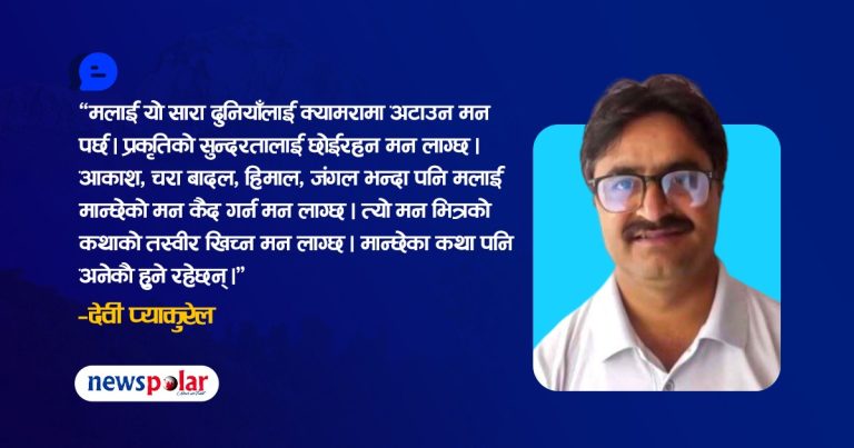 विस्तारै घाम छिप्पीदै छ । असोजको महिना, पीपलका पातहरु हावामा खेलिरहेका छन् । सबेरै उठेर उत्तर तर्फ हेर्छु । मन अल्लादीत हुन्छ । पर...चारकोसेका अग्ला अग्ला रुखहरु, ठिक त्यस माथि चुरे पहाड बसेको जस्तो,त्यो भन्दा माथि महाभारत पर्वत श्रृखला र त्यसमा यात्रा गरि रहेका बादलहरु, बादलले छेकेका सेता हिमाल अनि