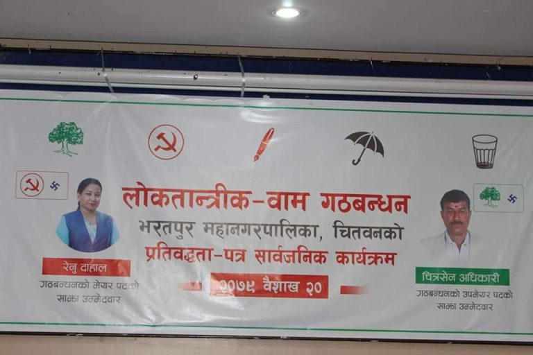 काठमाडौं । भरतपुर महानगरपालिकामा मेयर पदमा गठबन्धनले अघि सारेको नेकपा (माओवादी केन्द्र) की उम्मेदवार रेनु दाहालविरुद्ध स्वतन्त्र उम्मेदवारी दिएका नेपाली