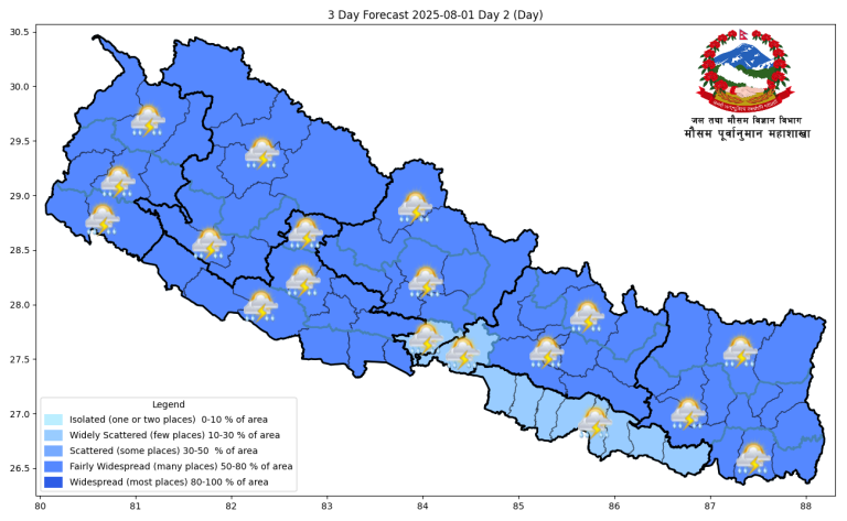 देशका पहाडी भू–भागका केही स्थानमा तथा तराई भू–भागका थोरै स्थानमा मेघगर्जन/चट्याङसहित मध्यम वर्षाको सम्भावना रहेको छ ।