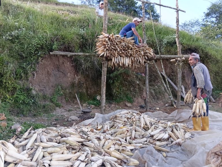 भोजपुर। देशभर दसैँको माहोल सुरु भइसक्दा भोजपुरको लेकाली भेगका किसानलाई भने मकैबाली थन्काउने चटारो छ । यहाँ प्रायः भदौ र असोज महिनामा मकै पाक्ने भएकाले किसानहरू खेतबारीमा भेला भएर मकै भाँच्ने, सुकाउने र भण्डारण गर्ने काममा बेस्त हुन्छन् । यहाँको लेकाली क्षेत्रको प्रमुख अन्नबालीका रूपमा मकैलाई लिइन्छ । यहाँ धान उत्पादन