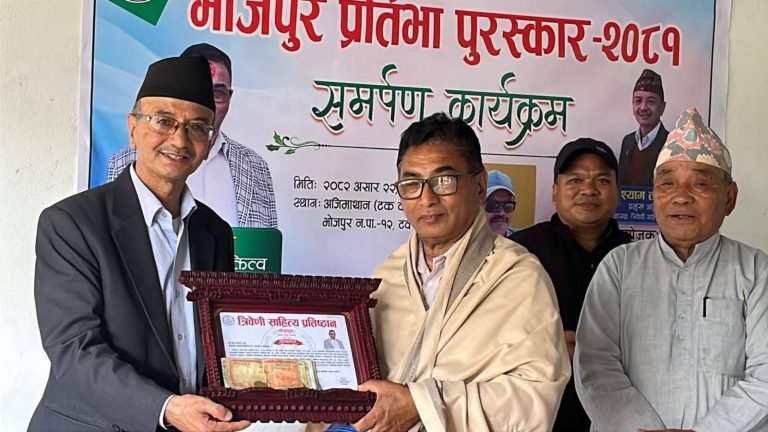 टक्सार, (भोजपुर) । प्रत्येक बर्ष एक स्रष्टालाई प्रदान गरिँदै आएको ‘भोजपुर प्रतिभा पुरस्कार’बाट टक्सार निवासी प्रेम शाक्य पुरस्कृत हुनुभएको छ । त्रिवेणी साहित्य प्रतिष्ठान भोजपुरले शाक्यलाई आइतबार एक कार्यक्रमबीच सम्मान तथा पुरस्कृत गरेको हो । विसं २०४५ देखि वाद्यवादकका रुपमा अनवरत क्रियाशील शाक्यले विशेषत: नेवारी समुदायमा प्रचलित खीं, धा, धिमे,