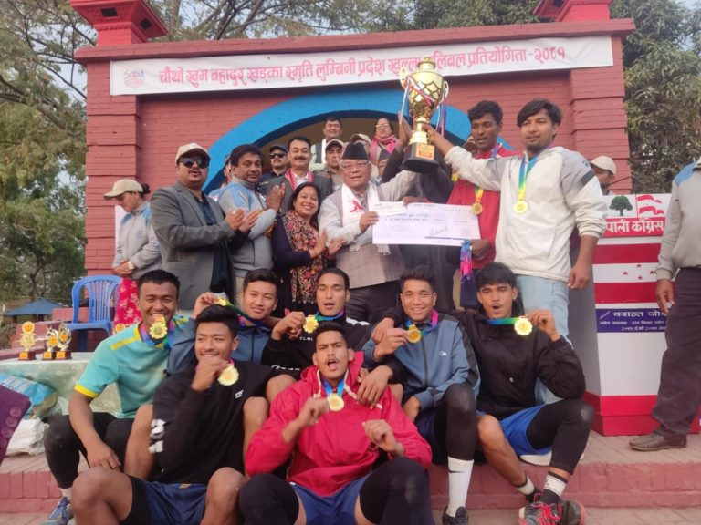 दाङ। चौथो खुमबहादुर खड्का स्मृति लुम्बिनी प्रदेशस्तरीय खुला पुरुष भलिबल प्रतियोगिताको उपाधि मणिमुकुन्द भलिबल क्लब रुपन्देहीले जितेको छ । घोराहीमा शनिबार भएको फाइनल खेलमा न्यु होराइजन स्पोट्र्स क्लब बुटवललाई १ का विरुद्ध ३ सेटले बिजयी भएको हो । कडा प्रतिष्पर्धात्मक खेलमा मणिमुकुन्द भलिबल क्लबले २५–१४,२७–२९,२५–१९ र २५–२० को जीत निकाल्दै