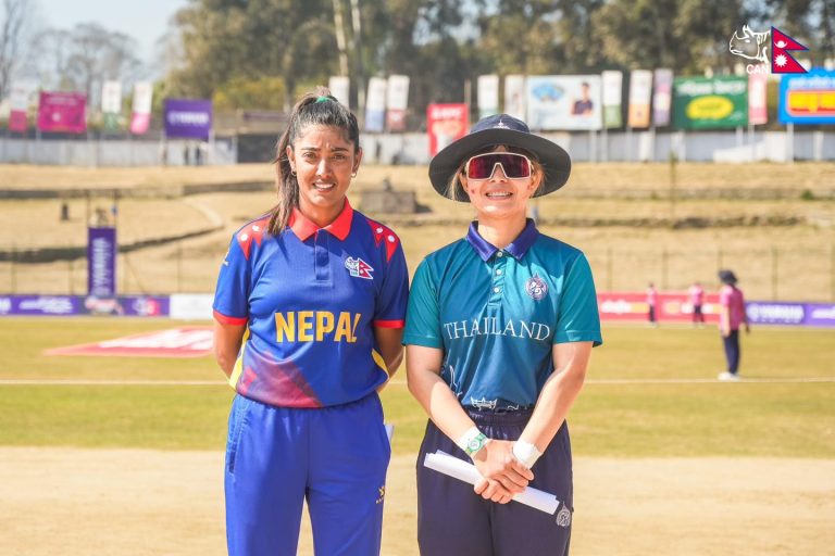 काठमाडौँ । महिला टी–ट्वान्टी श्रृङ्खलाको अन्तिम खेलमा नेपालले थाइल्याण्डविरुद्ध ब्याटिङ गरिरहेको छ । कीर्तिपरस्थित त्रिवि क्रिकेट मैदानमा नेपाली टोलीकी कप्तान इन्दु बर्माले टस जितरे पहिला ब्याटिङ रोजेकी हुन् । नेपाल यसअघि खेलेका पााचवटै खेलमा पराजित भएको छ । यसअघि नेपाल नेदरल्याण्डससँग २० रन, १५ रन र १० विकेटले तथा थाइल्याण्डसँग