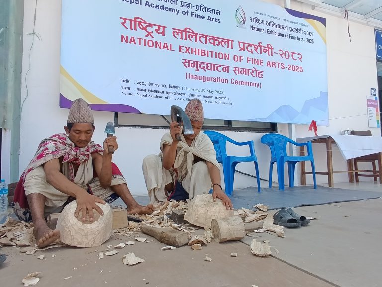 काठमाडौँ । नेपाल ललितकला प्रज्ञा प्रतिष्ठानको एक छेउमा सुर्खेतबाट आएका राउटे दीपक शाही बसिलाले टुनीको काठमा आकार दिँदै हुनुहुन्छ । उहाँको छेवैमा धयर शाही पनि टुनीको ठेउकोलाई आकारमा ढाल्दै हुनुहुन्छ । उहाँहरुका साथमा राउटे समुदायकि महिला बाटुली र सुरमानी कपडामा बुट्टा भर्दै हुनुहुन्छ । आफ्नै पोसाकमा सजिएका उनीहरु असिनपसिन भएर