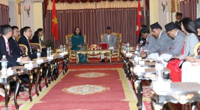 काठमाडौ । नेपाल भ्रमणमा रहेकी भियतनामकी उपराष्ट्रपति वो थि आन्ह सुआनले सोमबार राष्ट्रपति रामचन्द्र पौडेलसँग शिष्टाचार भेट गर्नुभएको छ ।