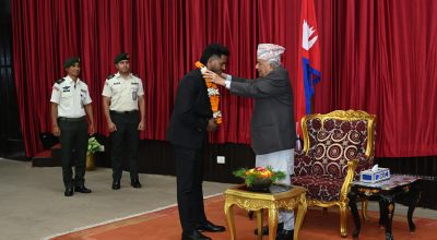 काठमाडौँ । भारतको नोएडामा सम्पन्न म्याट्रिक्स फाइट नाइट (एमएफएन)को उपाधि जित्नुभएका रविन्द्र ढाँट राष्ट्रपति रामचन्द्र पौडेलद्वारा सम्मानित हुनुभएको छ ।