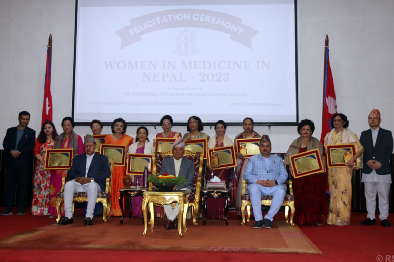 काठमाडौँ । राष्ट्रपति रामचन्द्र पौडेलले नेपाल चिकित्सक सङ्घले घोषणा गरेको यस वर्षको ‘वुमन इन मेडिसिन इन नेपाल २०२३ अवार्ड’ पाँच जना चिकित्सकलाई प्रदान गर्नुभएको छ । राष्ट्रपति भवन शीतल निवासमा आज आयोजित कार्यक्रममा चिकित्सा क्षेत्रमा महत्वपूर्ण योगदान पुर्याएवापत डा अर्चना अमात्य, डा गीता शाक्य, डा मीता सिंह, डा कोकिला वैद्य
