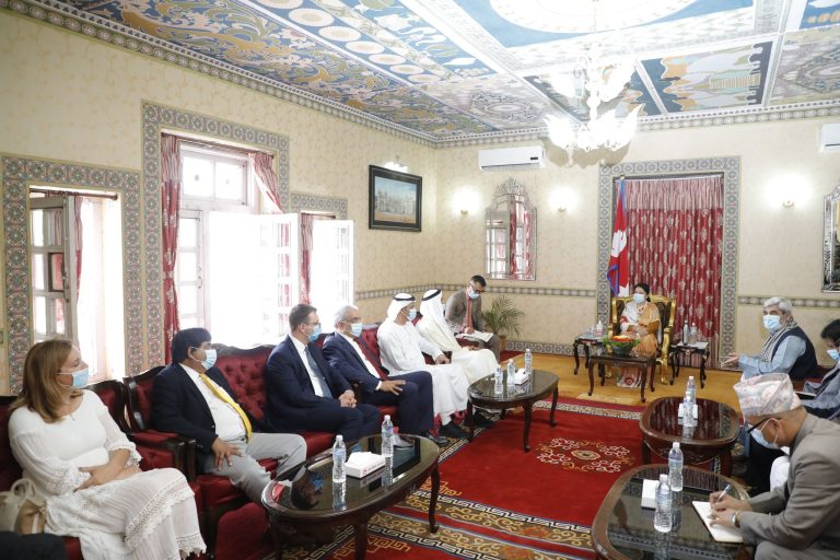 काठमाडौँ । राष्ट्रपति विद्यादेवी भण्डारीसँग ग्लोबल काउन्सिल फर टोलेरेन्स एण्ड पिस संस्थाका अध्यक्ष अहमद अल जरावानको नेतृत्वको संसदीय प्रतिनिधिमण्डलले शिष्टाचार भेट गरेको छ । नेपाल भ्रमणमा रहेको टोलीले राष्ट्रपति भण्डारीसँग आज राष्ट्रपति कार्यालय शीतल निवासमा भेट गरेको हो । भेटमा प्रतिनिधिसभाका सांसद हृदयेश त्रिपाठी, प्रतिनिधिमण्डलमा विभिन्न आठ देशका संस्थासँग आवद्ध