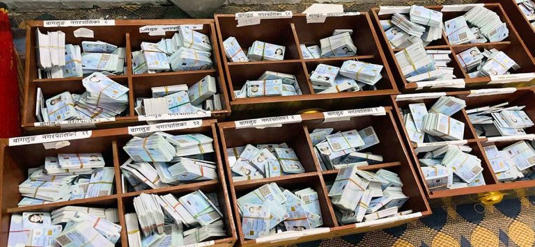 बागलुङ। सेवाग्राही परिचयपत्र लिन नआएपछि जिल्ला प्रशासन कार्यालय बागलुङमा १५ हजार आठ सय ३८ राष्ट्रिय परिचयपत्र थन्किएका छन्। राष्ट्रिय परिचयपत्रको फारम भरेर अधिकांश व्यक्ति विदेशिएका कारण परिचयपत्र लिन नआएको कार्यालयका प्रशासन शाखा प्रमुख रामप्रसाद उपाध्यायले जानकारी दिए। उनले नयाँ परिचयपत्रका लागि दैनिक दुई सयसम्म सेवाग्राही आउने भए पनि तयारी अवस्थामा