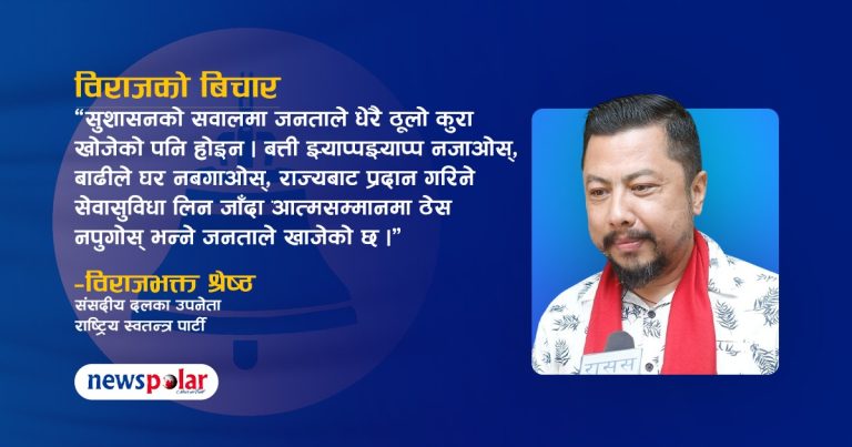काठमाडौँ। राष्ट्रिय स्वतन्त्र पार्टी (रास्वपा) संसदीय दलका उपनेता विराजभक्त श्रेष्ठ काठमाडौँ निर्वाचन क्षेत्र नं ८ बाट प्रतिनिधिसभामा प्रतिनिधित्व गर्नुहुन्छ । नौ वर्षअघि विवेकशील नेपाली दल हुँदै राजनीतिमा प्रवेश गर्नुभएका पूर्वयुवा तथा खेलकुदमन्त्री श्रेष्ठ बागमती प्रदेशका पूर्वप्रदेशभा सदस्य हुनुहुन्छ । पर्यटन व्यवसायीसमेत रहनुभएका उहाँ सम्पदा संरक्षणलगायत विभिन्न सामाजिक सेवामा आबद्ध हुनुहुन्छ