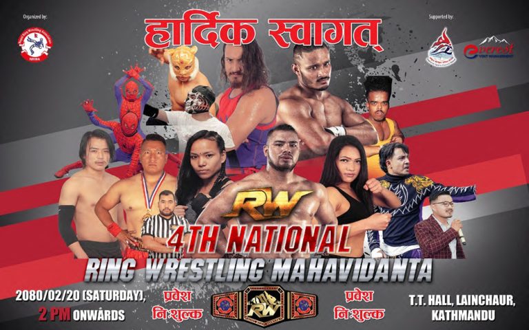 काठमाडौँ । नेपाल रिङ रेस्लिङ सङ्घको आयोजनामा चौथो राष्ट्रिय रिङ रेस्लिङ प्रतियोगिता आज हुने भएको छ । प्रतियोगितामा विभिन्न पाँच प्रतिस्पर्धा हुने र सबैमा नगद पुरस्कार राखिएको आयोजक सङ्घकी महासचिव सुवर्ण श्रेष्ठले जानकारी दिए । जसमा हेभीवेट विजेताले रु एक लाख ५५ हजार, ट्रिपल थ्रेट म्याच विजेताले एक लाख २५
