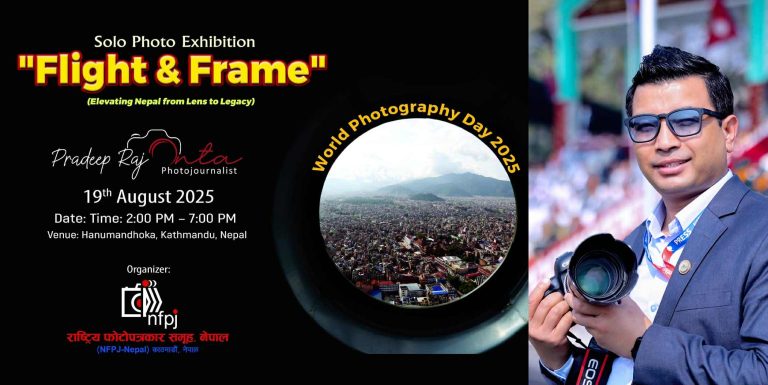 काठमाडौं। १८६ औं विश्व फोटोग्राफी दिवसको अवसरमा राष्ट्रिय फोटोपत्रकार समूह (एनएफपिजे नेपाल) फोटो प्रदर्शनी गरेर मनाउने भएको छ । यस वर्ष सस्थाका केन्द्रीय अध्यक्ष प्रदीपराज वन्तको FLIGHT & FRAME नामक एकल फोटो प्रदर्शनी गर्ने भएको हो । भदौ ३ गते अगष्ट १९का दिन काठमाडौंको हनुमानढोका परिसरमा दिउँसो २ बजेदेखि साँझ