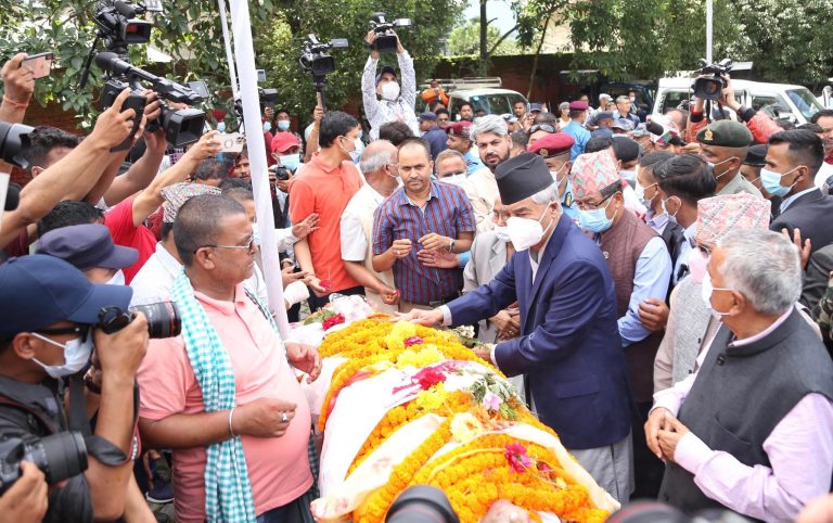 काठामाडौँ । नेपाली कांग्रेसका सभापति एव प्रधानमन्त्री शेरबहादुर देउवाले पार्टीका केन्द्रीय सदस्य प्रदीप गिरीको पार्थिव शरीरमा पार्टीको झण्डा ओढाएर श्रद्धाञ्जलि व्यक्त गर्नुभएको छ । पार्टी केन्द्रीय कार्यालय सानेपामा नेता गिरीको पार्थिव शरीरलाई श्रद्धाञ्जलिका लागि राखिएको छ । उहाँको आजै पशुपतिस्थित आर्यघाटमा अन्त्येष्टि हुनेछ । प्रतिनिधिसभा सदस्य समेत रहनुभएका गिरीको शनिबार