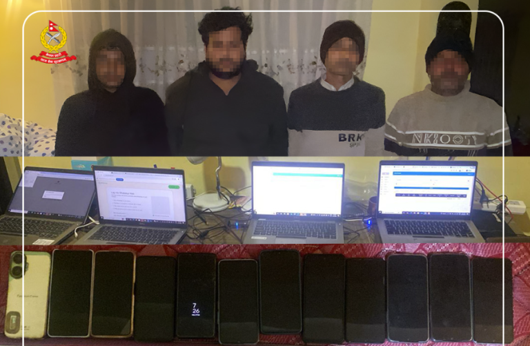 काठमाडौँ । जिल्ला प्रहरी परिसर काठमाडौंले अनलाईन बेटिङ खेल्ने/खेलाउने कार्यमा संलग्न चार जना भारतीय नागरिकहरुलाई पक्राउ गरेको छ । पक्राउ पर्नेमा भारत उत्तर प्रदेश गोरखपूरका २२ बर्षीय आरीफ हुसेन, सोहि स्थानका २५ बर्षीय अविशेक मदेसिया, फत्तेपूरका ४२ बर्षीय अब्दुल कलाम र सोहि स्थानका ४० बर्षीय ईरफान पठान रहेका छन् ।