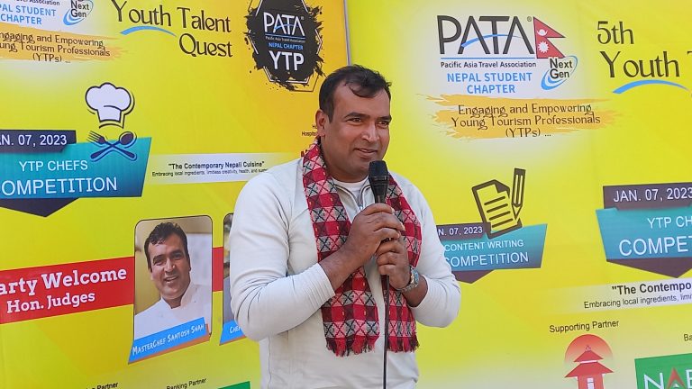 काठमाडौँ । चर्चित बिबिसी मास्टर सेफ सन्तोष साहले व्यावसायिक सेफमार्फत् नेपाली खानाको प्रवर्द्धन गरिनुपर्ने बताएका छन् । प्यासिफिक एशिया ट्राभल एशोसियशन (पाटा) नेपाल च्याप्टरले शनिबार नेपाल पर्यटन तथा होटल व्यवस्थापन प्रतिष्ठान (नाथम)मा आयोजना गरेको ‘पाटा युवा पर्यटन प्रोफेशनल सेफ प्रतियोगिता’मा बोल्दै उनले नेपाली परिकारको प्रवद्र्धन तथा युवा पुस्तालाई यस क्षेत्रमा