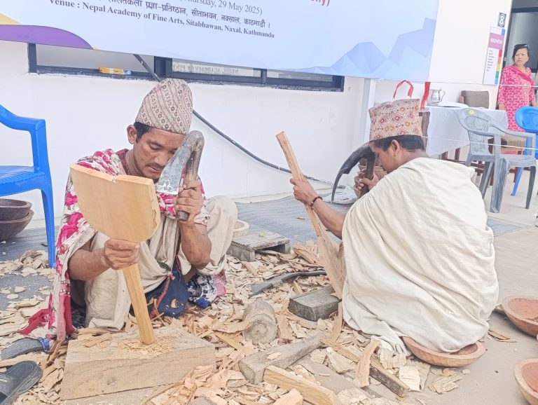 काठमाडौँ। नेपाल ललितकला प्रज्ञा प्रतिष्ठान नक्साल काठमाडौँमा आज लोपोन्मुख समुदाय राउटेले  काठको पन्यू बनाएर प्रदर्शन गरेका छन् । जारी राष्ट्रिय ललितकला प्रदर्शनीमा सहभागी राउटेले प्रत्यक्ष कला कार्यशाला (लाइभ आर्ट डेमोस्ट्रेसन)मा आफ्ना मौलिक कला प्रस्तुत गरेका हुन् । राउटेहरूको यो हस्त तथा शिल्पकला दैनिक जीवनमा प्रयोग हुँदै आएको छ । ललितकला