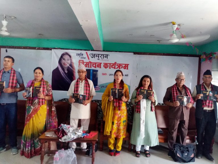 दाङ। साहित्यकार स्मृति योगीको ‘अनुराग’ गजलसङ्ग्रहको आज घोराहीमा एक कार्यक्रमबीच विमोचन गरिएको छ । राप्ती साहित्य परिषद् जिल्ला शाखा दाङको आयोजनामा उक्त गजलसङ्ग्रह विमोचन गरिएको हो । राप्ती साहित्य परिषद् दाङका अध्यक्ष यम रेग्मी, साहित्यकार बुनु लामिछानेलगायतले उक्त गजलसङ्ग्रहको विमोचन गर्नुभएको हो । उक्त गजलसङ्ग्रहमा विभिन्न विषयसँगै गत चैत १५ गते