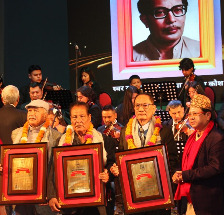 काठमाडौँ : स्वरसम्राट नारायण गोपालको ३४औँ स्मृति दिवसका अवसरमा तीन श्रष्टालाई सम्मान गरिएको छ । नारायण गोपाल सङ्गीत कोषले बुधबार साँझ एक कार्यक्रम आयोजना गरी ‘नारायण गोपाल स्मृति सम्मान २०८१’ मार्फत सङ्गीततर्फ सङ्गीतकार बुलु मुकारुङ, गायनतर्फ कुमार बस्नेत र गीत रचनातर्फ शिवशङ्कर थापालाई सम्मान गरिएको हो । स्वरसम्राट नारायण गोपालसँग